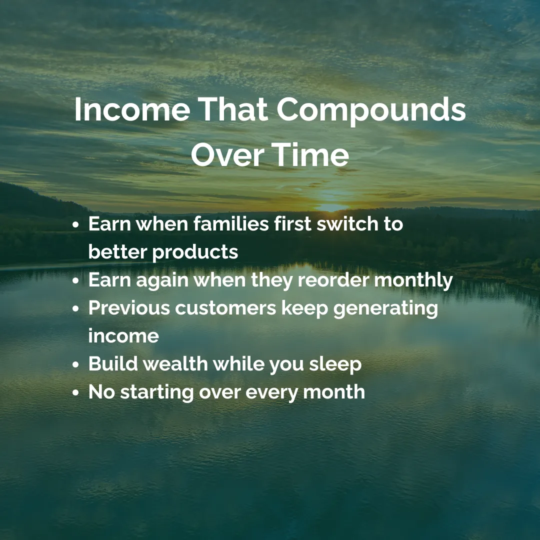 - This month you help families. Next month, those families reorder AND you help new families. That's how residual income compounds.-